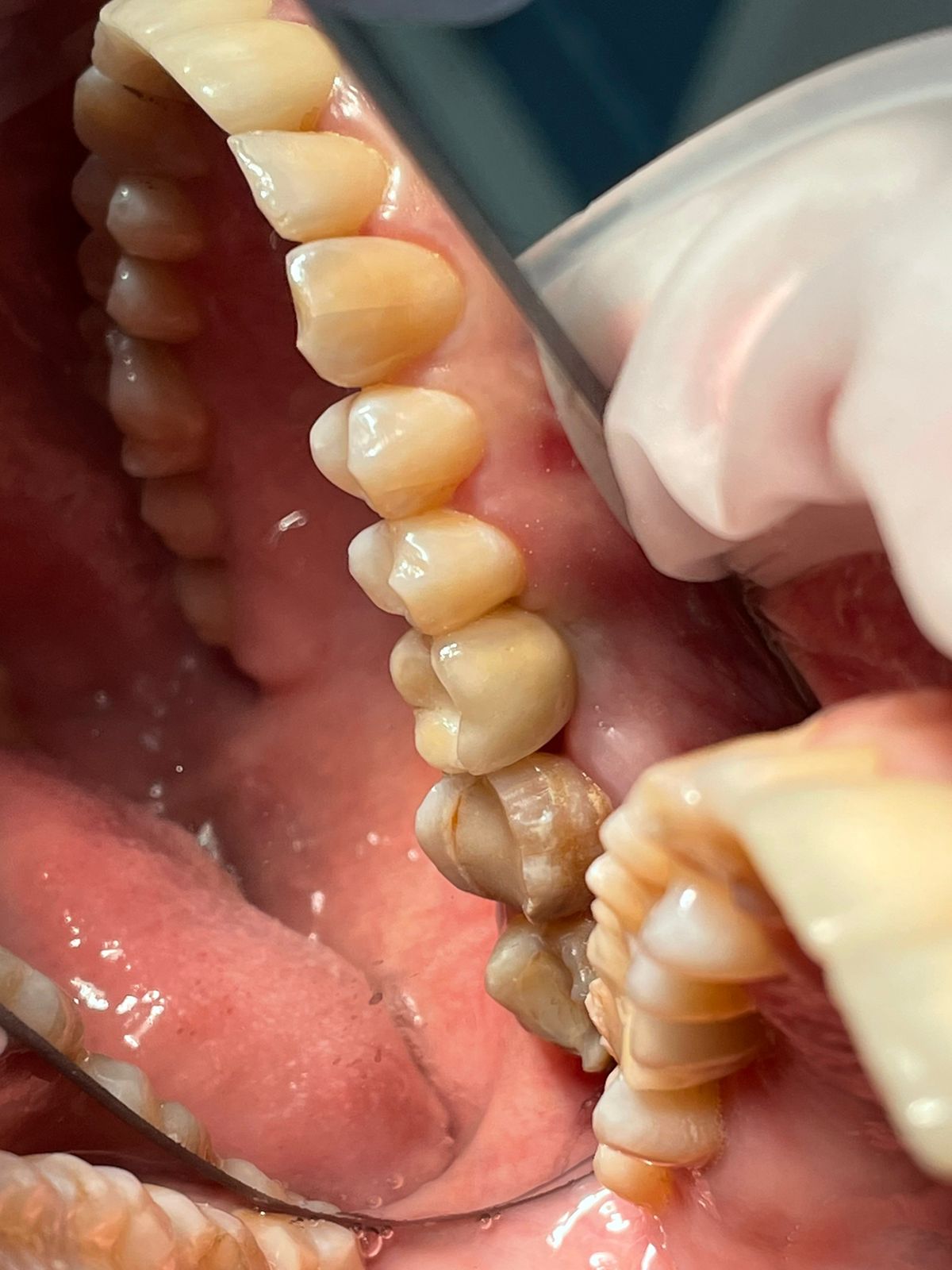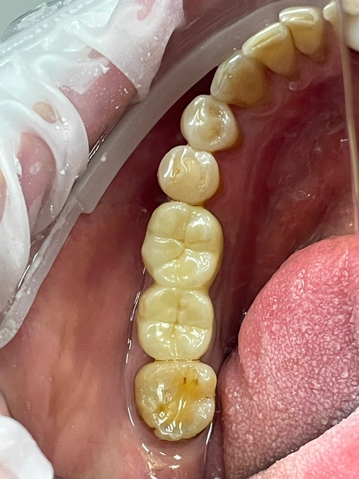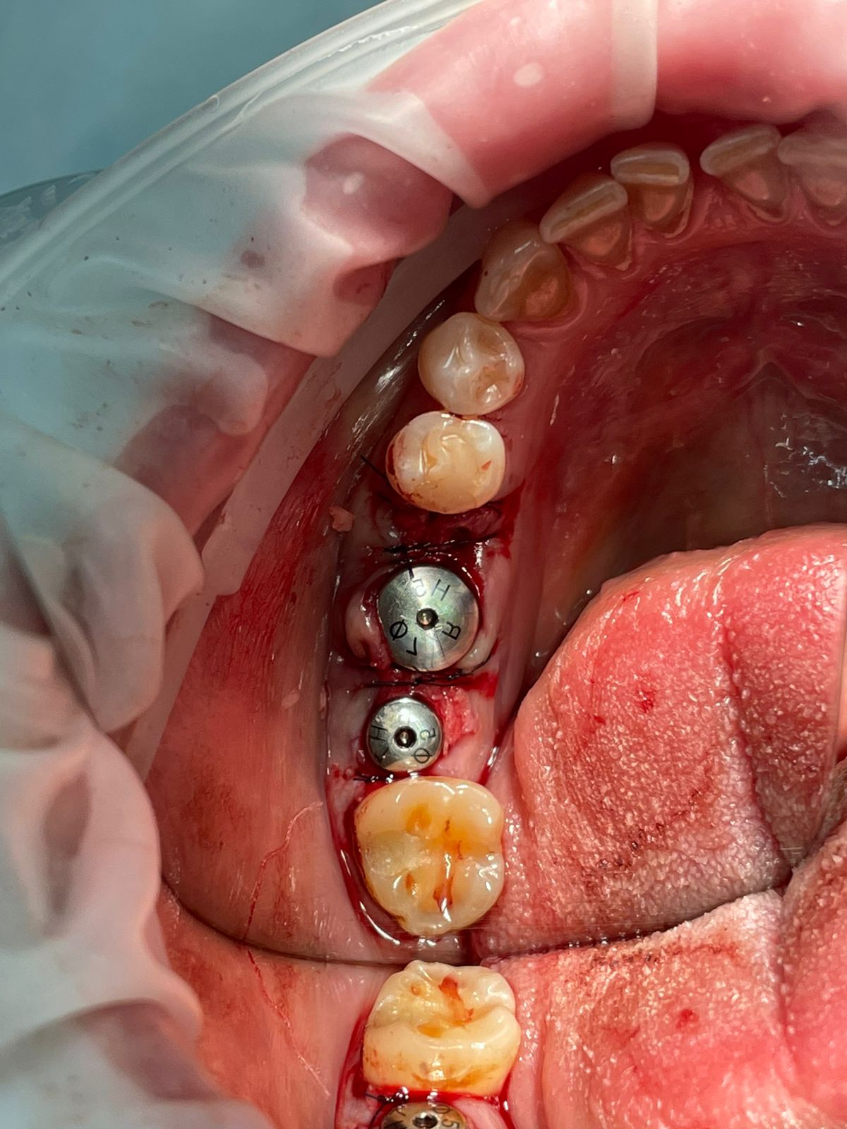 Одномоментное удаление Зубов 36, 37 с установкой дентальных имплантатов, через 4 месяца постоянное протезирование коронками из диоксида циркония на индивидуальных титановых аббатментах.